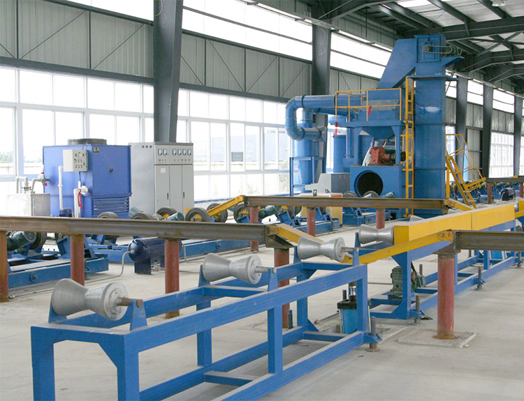 該系列鋼管拋丸清理機是輥道送料的大、中、小型管徑鋼管及圓柱體拋丸清理設(shè)備,主要是利用高效拋丸器拋出的高速彈丸流束,打擊鋼管表面上的氧化皮、銹層及其雜物,使之獲得精細(xì)光亮表面,提高工件表面的抗拉和抗壓強度,并具有一定表面粗糙度,為其表面涂漆保護(hù)增加附著力,有利于提高鋼管涂飾質(zhì)量,達(dá)到防腐、護(hù)管、延長鋼管使用壽命之目的。